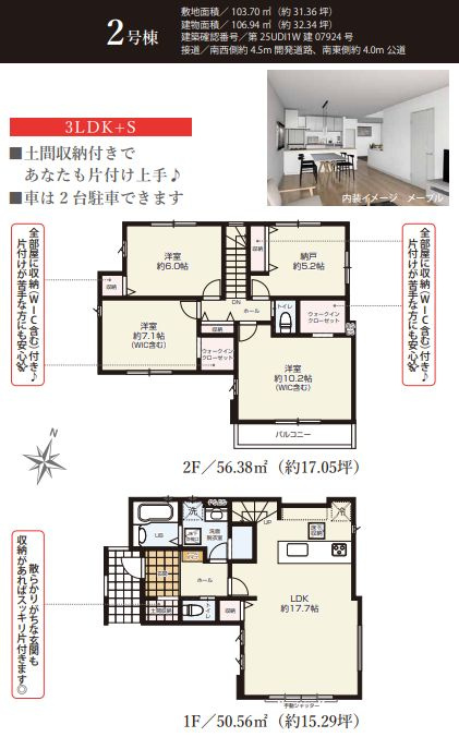 | 間取りと収納 | 3SLDK、ウォークインクローゼット・床下収納など | 将来の家族構成や荷物の増減に柔軟に対応できます(1号棟/2号棟ともに3SLDK、収納充実) |
